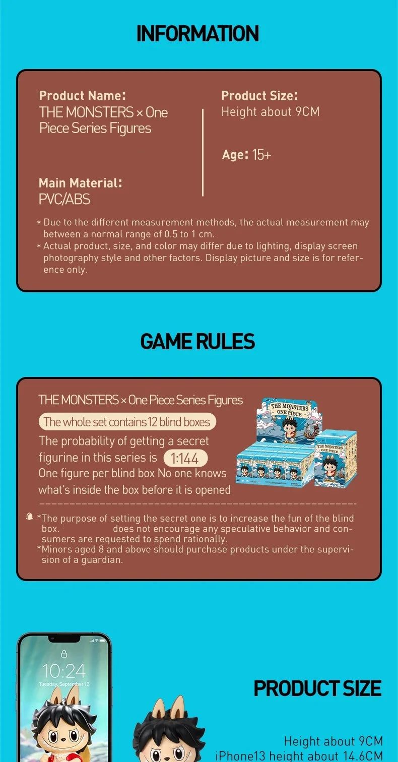 Step into a world of anime magic with the official THE MONSTERS × One Piece blind box series! Each sealed box contains 1 mystery collectible figure inspired by the most iconic One Piece characters — reimagined in adorable, stylized "THE MONSTERS" form.